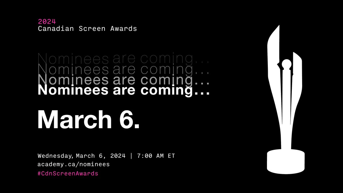 Canadian Screen Awards 2024 Nominations – Nominees for the country’s combined film and TV awards will be unveiled on March 6. By Etan Vlessing Canada Bureau Chief The Academy of Canadian Cinema & Television has pushed the dates for the . Screen Actors Guild Awards presented by SAG-AFTRA will stream live on Netflix on Saturday, February 24 at 8/7c. Broadcasting live from the Shrine Auditorium & Expo .